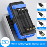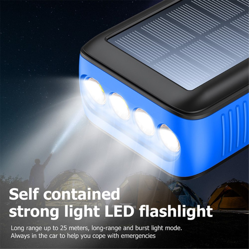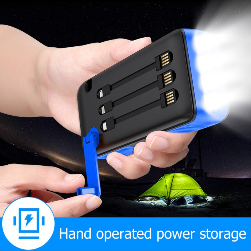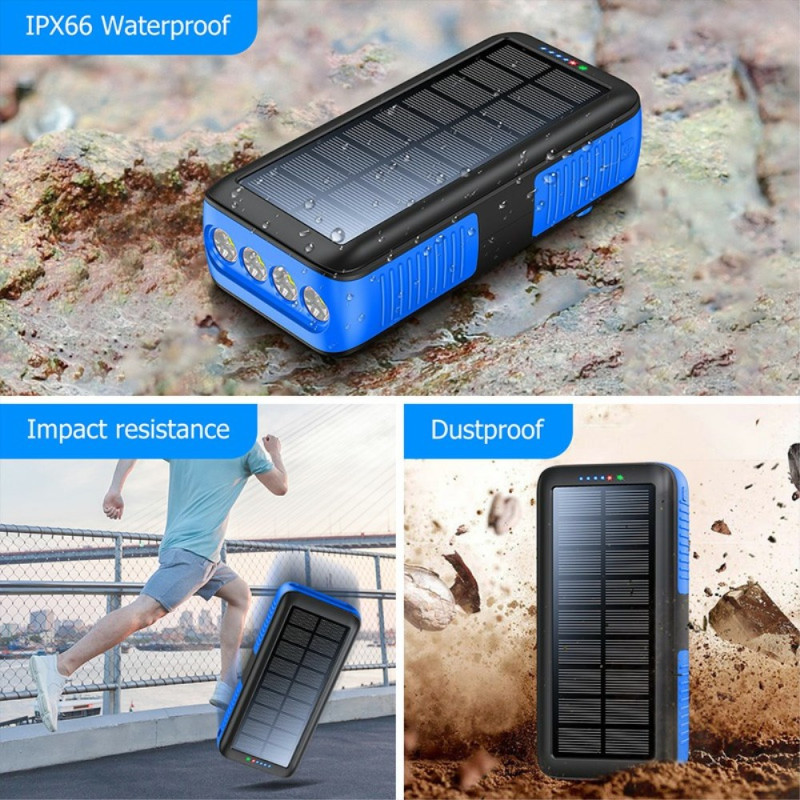 Kun sähkön saanti ei ole taattu, tämä ulkoinen akku on välttämätön selviytymisväline. Se on suunniteltu pitkille retkille ja hätätilanteisiin, ja sen kapasiteetti on 30000 mAh. Sen ainutlaatuinen kaksoislatausmenetelmä - aurinko- ja kampiakku - takaa jatkuvan itsenäisyyden, vaikka olisitkin ilman sähköverkkoa. IP66-luokituksen ansiosta se on vankka, kestävä ja kestää vesiroiskeita ja pölyä. Turvallisuuden takaamiseksi se sisältää tehokkaan 4 LED-valonheittimen, jossa on SOS-tila. Lisäksi kolme irrotettavaa kaapelia (Lightning, Type-C, Micro) poistavat ylimääräisten lisävarusteiden kantamisen tarpeen ja tarjoavat maksimaalisen monipuolisuuden.