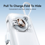 Järjestely ja teho ovat tämän JOYROOM-ulkoisen akun ytimessä, joka on suunniteltu yksinkertaistamaan kaapelien hallintaa. Se sisältää kaksi 70 cm:n sisäänvedettävää Type-C-kaapelia, joten ylimääräisiä johtoja ei tarvitse kantaa mukana. Tämä 10000 mAh:n yksikkö tuottaa vaikuttavan 35 W:n tehon, jonka avulla voit ladata laitteesi nopeasti, ja itse akku latautuu 27 W:n teholla. Suuri LED-näyttö näyttää jäljellä olevan akun tarkan prosenttiosuuden reaaliajassa. Matalan tehon tilan ansiosta voit myös turvallisesti syöttää virtaa pieniin laitteisiin, kuten kuulokkeisiin. Koko laite on suojattu PC+ABS-paloturvallisella materiaalilla.
