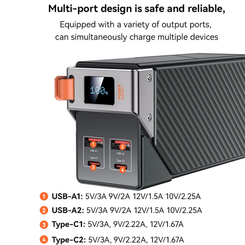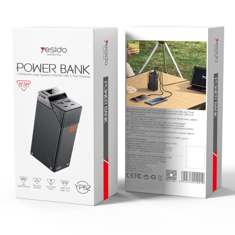 Tämän 30000 mAh:n yksikön neljän portin ansiosta poikkeuksellisen akun käyttöiän hallinta ei ole koskaan ollut näin monipuolista. Tämä YESIDOn ulkoinen akku tarjoaa luotettavaa, pidennettyä virtaa kaikille laitteillesi. Se tuottaa jopa 22,5 W pikalataustehoa USB-A- ja Type-C-lähtöjen kautta. Muotoilussa on käytetty sinkkiseosta ja PC/ABS-levyä kestävyyden ja ensiluokkaisen viimeistelyn lisäämiseksi. SW6236-älykkään ratkaisun sirulla varustettu laite takaa optimaalisen turvallisuuden latauksen aikana. Koko laite on CE- ja ROHS-sertifioitu, mikä osoittaa sen olevan eurooppalaisten turvallisuusvaatimusten mukainen.