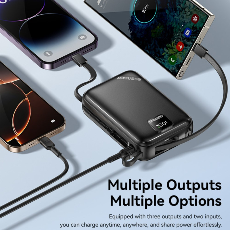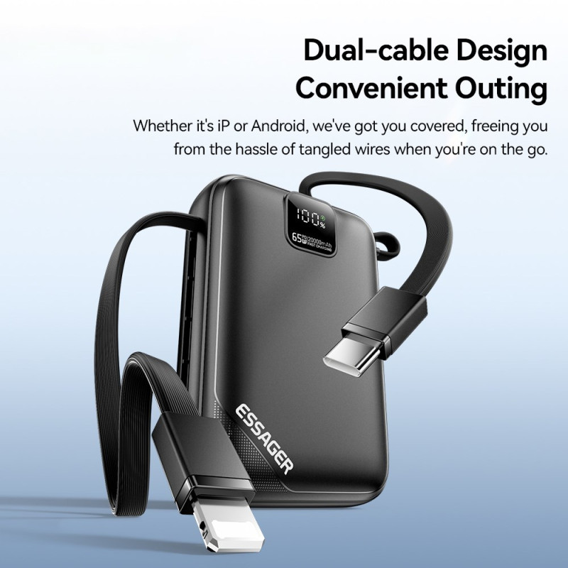 Huippuluokan matkapuhelimen tarvitsema teho on nyt saatavilla, ja siihen sisältyy täydellinen latausratkaisu. Tämä ESSAGER 20000mAh ulkoinen akku tuottaa maksimissaan 65 W:n tehon, mikä takaa kannettavien tietokoneiden, tablettien ja älypuhelimien nopean latauksen. Type-C- ja Lightning-kaapeleiden integrointi poistaa sekaannuksen, ja sen kapasiteetti pitää laitteesi virran päällä päiväkausia. Se tukee 60W:n tuloa itse akun nopeaa lataamista varten. Sen älykkään digitaalinäytön avulla voit hallita akun käyttöikää tarkasti, ja sen luotettavuudesta kertoo sen vaatimustenmukaisuus eurooppalaisten CE- ja RoHS-standardien kanssa.