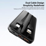 Täydellinen riippumattomuus ja saumaton organisointi yhdistyvät tässä ESSAGER 20000mAh ulkoisessa akussa. Tämä suurikapasiteettinen laite takaa useita latauksia kaikille laitteillesi ilman ulkoisten kaapeleiden vaivaa sen kahden integroidun kaapelin (Type-C ja Lightning) ansiosta. Se tarjoaa erittäin nopean, jopa 22,5 W:n lataustehon ja takaa tehokkaan virransyötön USB-A-portin ja Type-C-kaapelin kautta. Sen monipuolisella kokoonpanolla voit ladata jopa neljää laitetta samanaikaisesti. Älykäs LED-näyttö näyttää jäljellä olevan akun varaustason reaaliajassa, ja laite on CE- ja RoHS-sertifioitu Euroopan markkinoille.