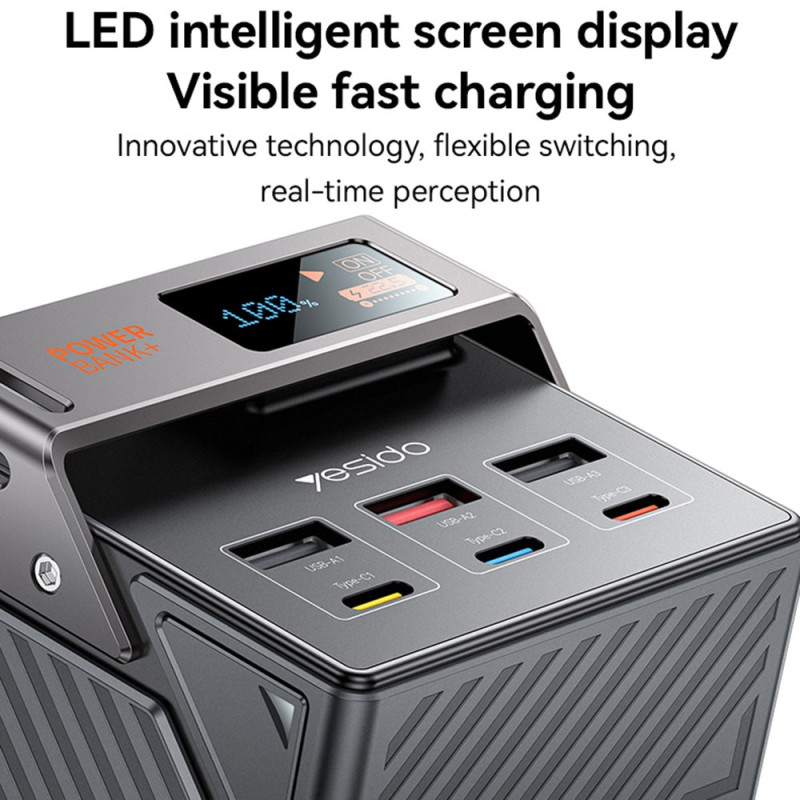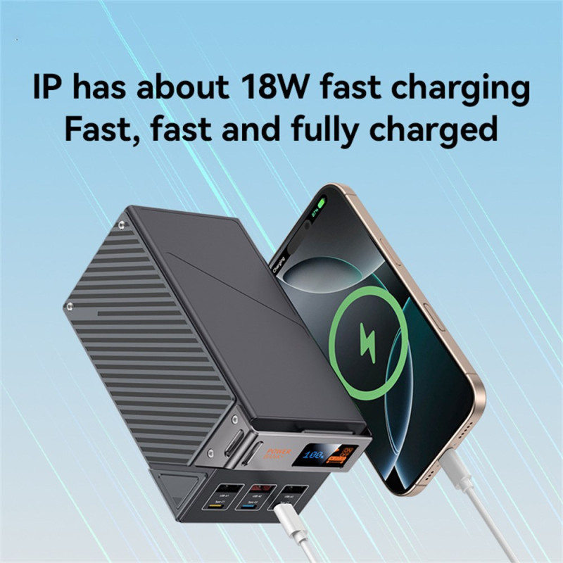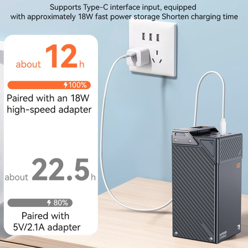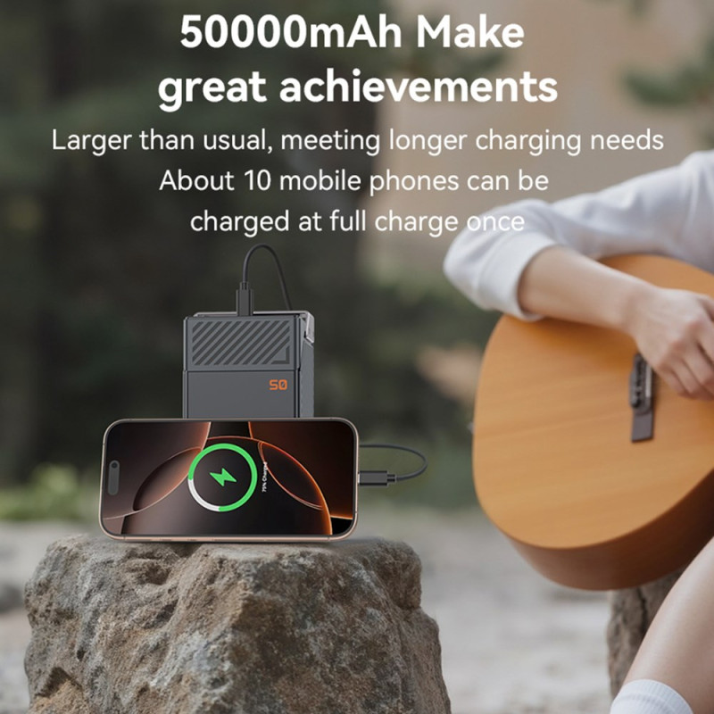 Ennennäkemätön autonomia ja jaettu latauskapasiteetti määrittelevät tämän 50000mAh:n ulkoisen akun, joka on suunniteltu ryhmille ja pitkille ajanjaksoille. Siinä on kuusi ulostuloa (3 Type-C, 3 USB-A), joiden avulla voidaan ladata useita laitteita samanaikaisesti. Pikalatausteho on 22,5 W (USB-A2:n kautta), mikä takaa tehokkaan virransyötön kaikille laitteille. Vankka sinkkiseos- ja PC/ABS-rakenne takaa maksimaalisen kestävyyden ja lujuuden. Digitaalinen näyttö mahdollistaa jäljellä olevan virran tarkan seurannan. Laite on CE- ja ROHS-sertifioitu, mikä takaa eurooppalaisten standardien noudattamisen.