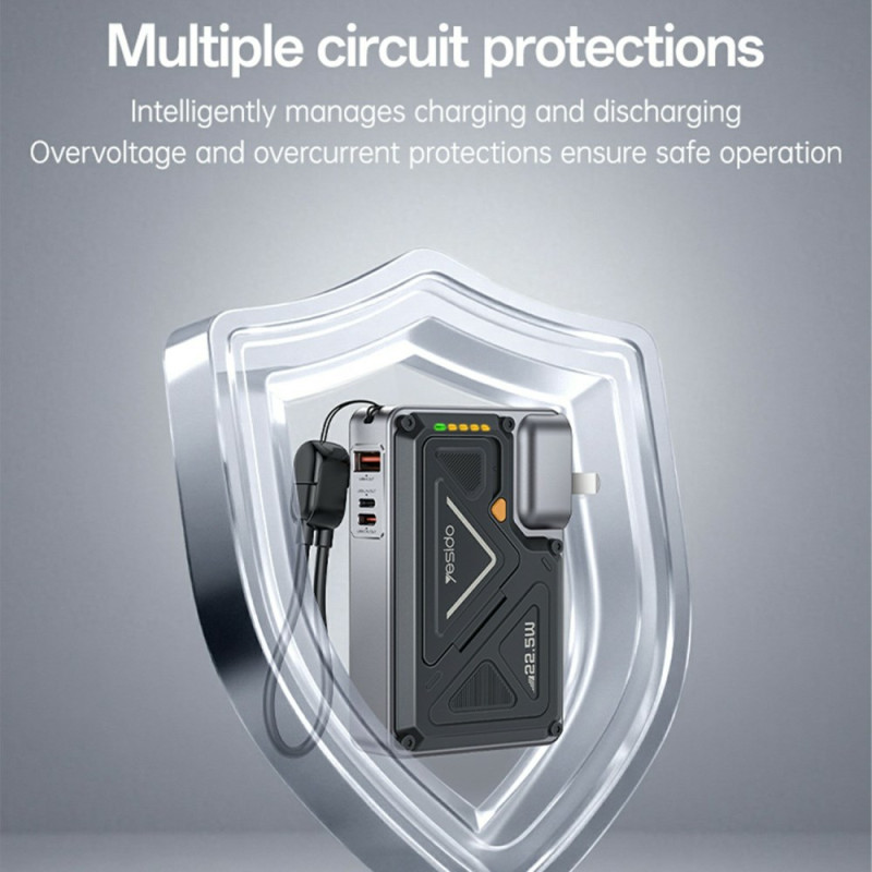 Seinälaturin ja langattoman akun yhdistäminen yhdeksi yksiköksi ratkaisee monien eri tilanteiden lataamisen haasteet. Tämä ulkoinen YESIDO-akku tarjoaa kaksi AC/DC-toimintoa, mikä takaa äärimmäisen monipuolisuuden. Se tarjoaa jopa 15 W:n magneettisen langattoman latauksen ja 22,5 W:n nopean langallisen latauksen (USB:n kautta). Laite sisältää integroidun jalustan vaakasuoraa katselua varten latauksen aikana. Turvallisuuden takaavat älykkäät hallintasirut ja V0-paloturvallinen PC-rakenne, ja neljä selkeää LED-merkkivaloa mahdollistavat lataustilan välittömän ja tarkan seurannan.