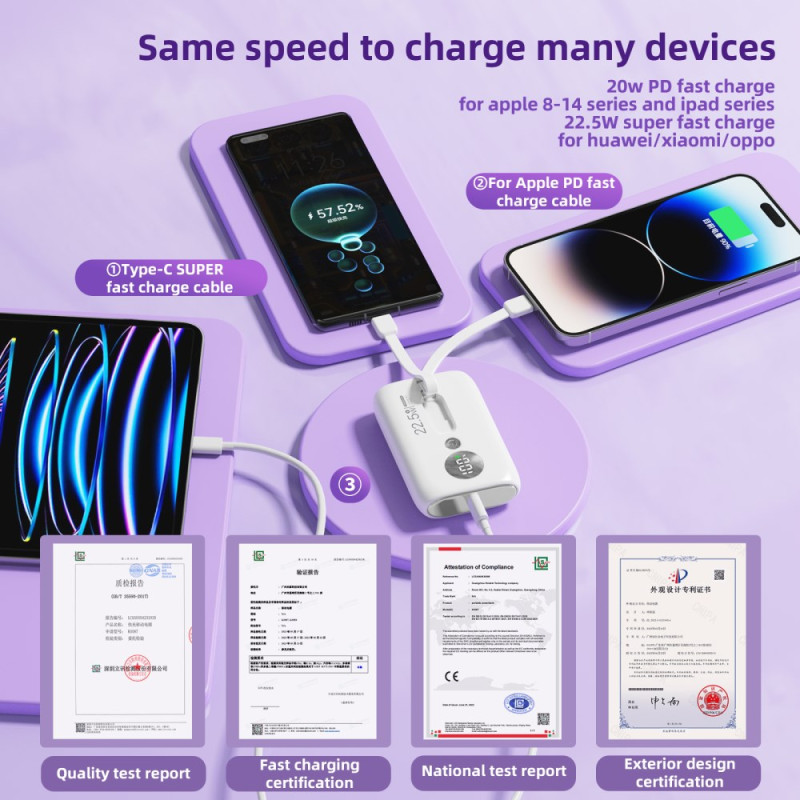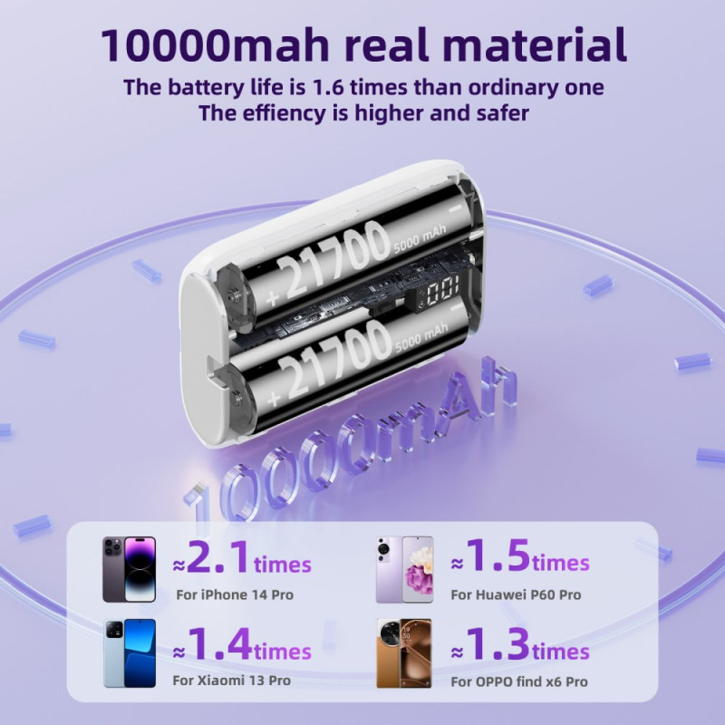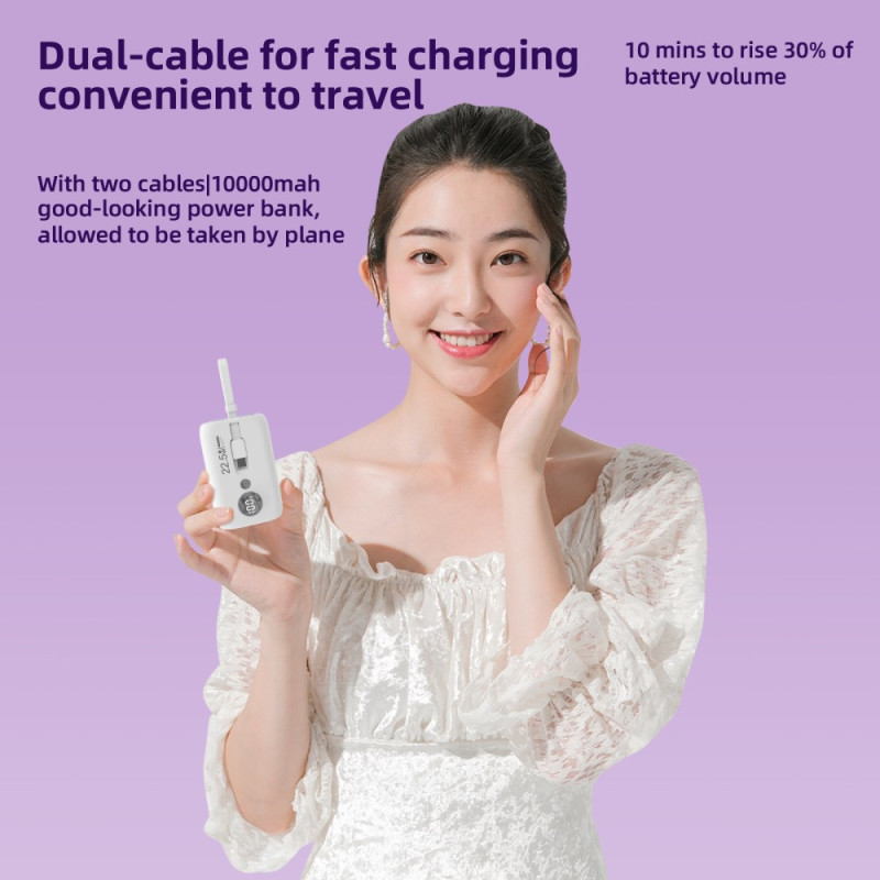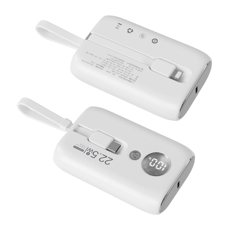 Edistyksellinen lämmönsäätö ja kaapelin integrointi määrittelevät uudelleen nopean latauksen taskumuodossa. Tämä ROISKIN 10000mAh ulkoinen akku on suunniteltu mahdollisimman käteväksi: se integroi kaksi kaapelia (Type-C ja Lightning), jotka toimivat myös kädensijana. Sen latausteho on 22,5 W (Type-C-kaapelin kautta), ja siinä käytetään uuden sukupolven sirua, joka pitää alhaisen lämpötilan ja säilyttää akkujen terveyden. Älykäs digitaalinen näyttö kertoo jäljellä olevan akun tarkan määrän ja korvaa merkkivalot. Kompakti ja kevyt, se on täydellinen liittolainen liikkuvuuteen.