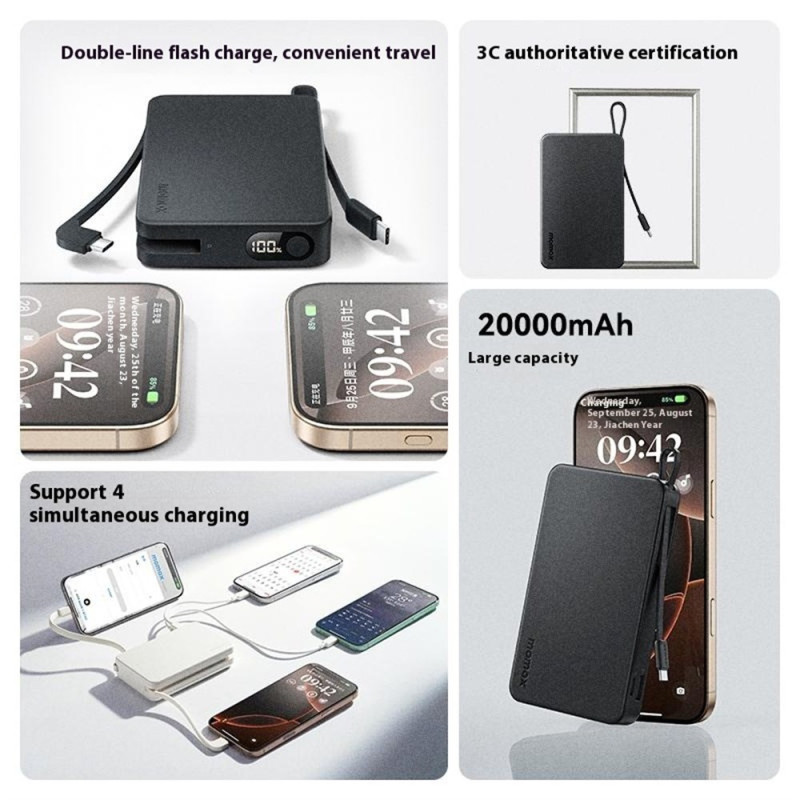 Tämä MOMAXin ulkoinen akku on välttämätön tuottavuusväline, ja se on täydellinen virtakeskus liikkeellä oleville ammattilaisille. Sen valtava 20 000 mAh:n kapasiteetti takaa pidennetyn autonomian kaikille laitteillesi. Se tuottaa 30 W:n maksimilataustehon, mikä takaa erittäin nopean latauksen. Kahden USB-C-kaapelin integrointi poistaa riippuvuuden ulkoisista johdoista ja tarjoaa täydellisen ja siistin ratkaisun. Neljän käytettävissä olevan lähdön ansiosta se voi ladata jopa neljä laitetta samanaikaisesti. PC+ABS-suojakuori takaa suuren kestävyyden.
