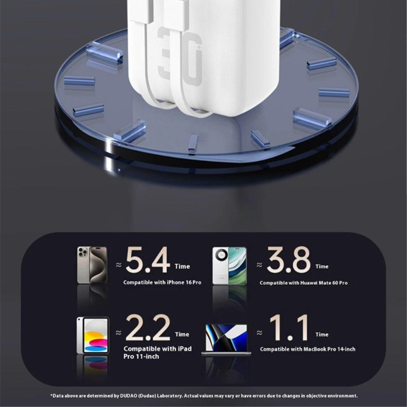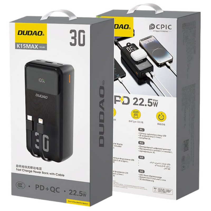 Tämä 27000 mAh:n ulkoinen akku tarjoaa runsaan energiavaraston, joka tukee useita täysiä latauksia, kun olet liikkeellä. Integroidut iP- ja Type-C-kaapelit helpottavat käyttöä, koska ylimääräisiä johtoja ei tarvitse kantaa mukana. PD 22,5 W:n pikalataus tarjoaa tehokasta virtaa yhteensopiville laitteille, ja kestävä PC-suojakuori takaa turvallisen käytön. Kompaktin kokonsa ansiosta sitä on helppo kuljettaa, vaikka kapasiteetti on näin suuri.