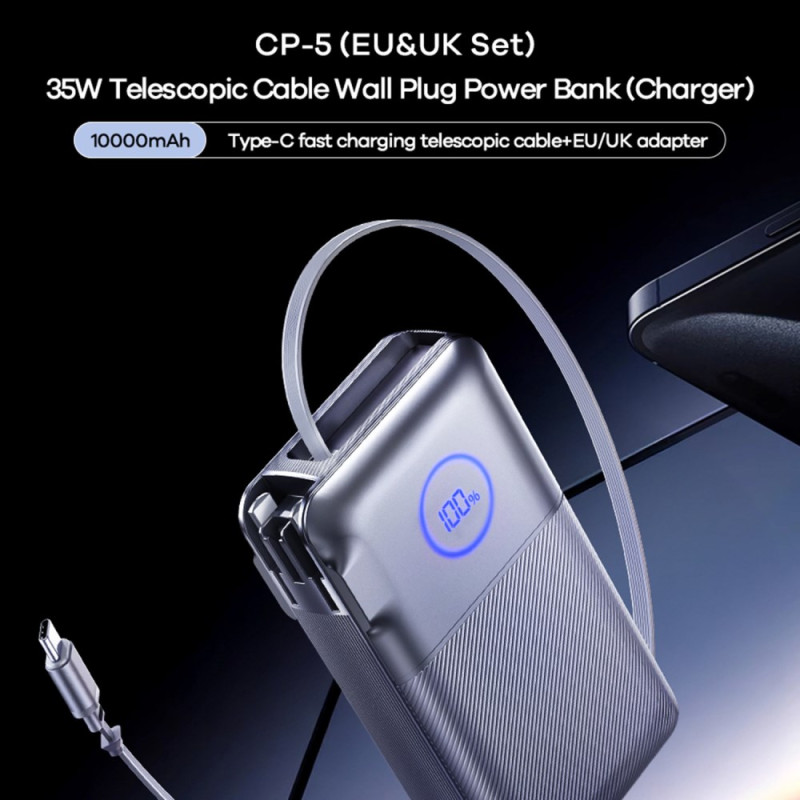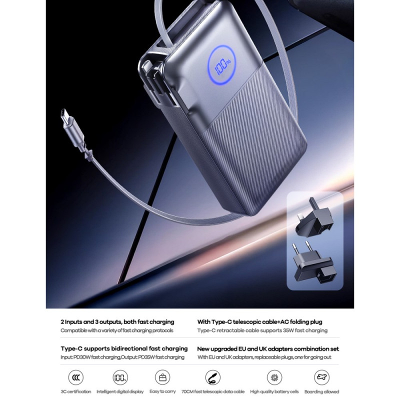Tämä matkojen helpottamiseksi suunniteltu ulkoinen akku yhdistää seinälaturin, sisäänvedettävän Type-C-kaapelin ja EU/UK-sovittimet yhteen kompaktiin yksikköön. Sen 35 W:n teho tarkoittaa, että voit ladata nopeasti laitteesi sekä itse power bankin. Kokoontaitettavan rakenteen ansiosta se on helppo säilyttää, ja LED-näyttö näyttää selkeästi energiatasot. Luotettavien polymeerikennojensa ansiosta se takaa vakaan ja turvallisen latauksen missä tahansa oletkin.
