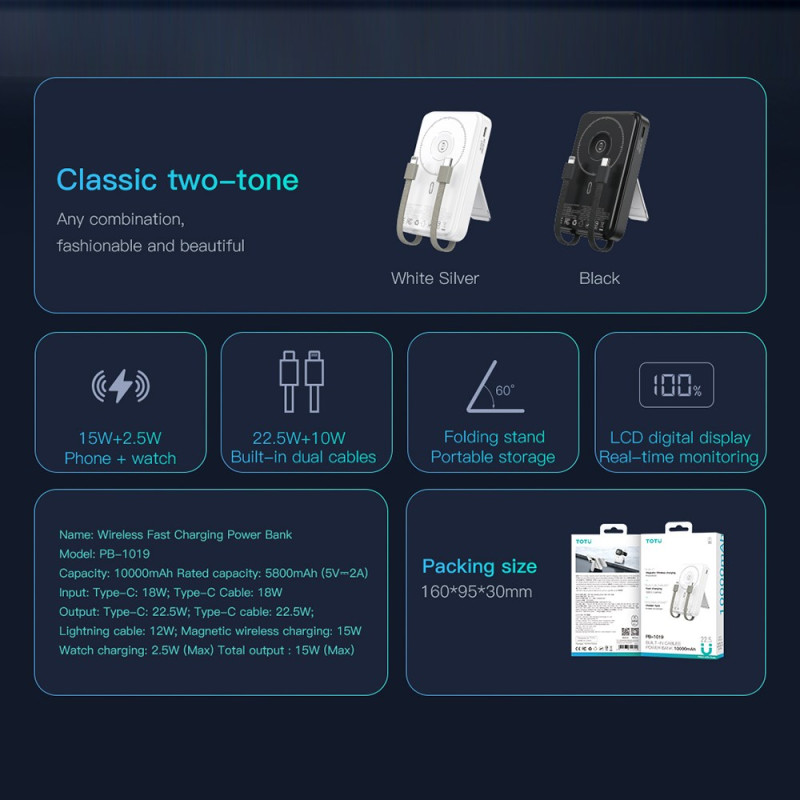 Tässä ulkoisessa magneettisessa akussa yhdistyvät teho ja käytännöllisyys, jotta se on mukana laitteissasi joka päivä. Sen 10000 mAh:n akku kestää mukavasti, ja jopa 15 W:n langattoman magneettilatauksen ansiosta yhteensopiviin älypuhelimiin on helppo ladata nopeasti virtaa. Type-C-portti ja integroidut kaapelit tarjoavat erilaisia latausvaihtoehtoja, mukaan lukien oma tila liitetyille kelloille. Sen integroidun jalustan avulla voit asettaa puhelimen vakaaseen asentoon latauksen aikana, mikä on ihanteellista videon katseluun tai ilmoitusten tarkistamiseen.