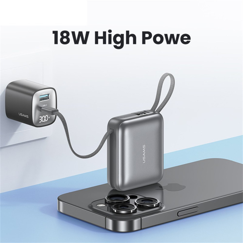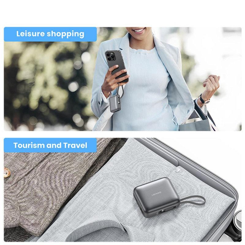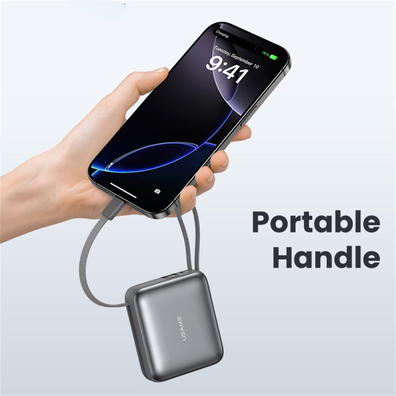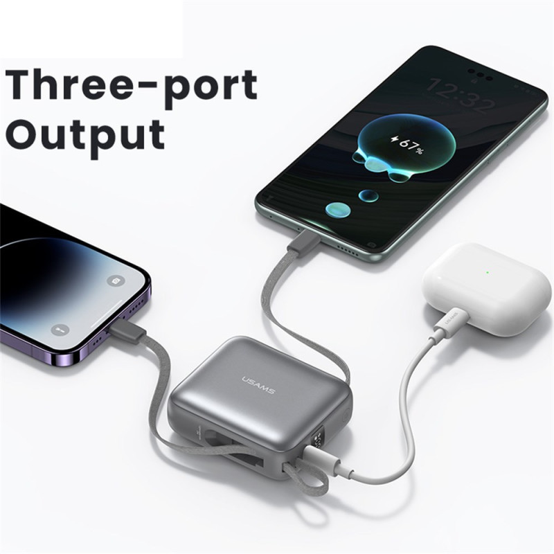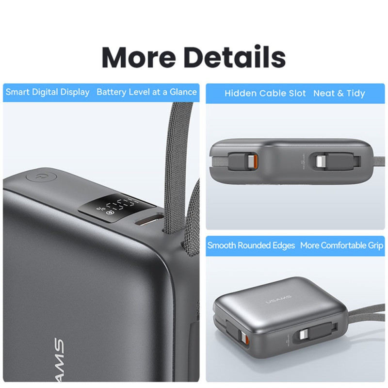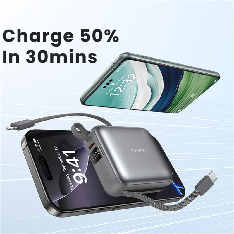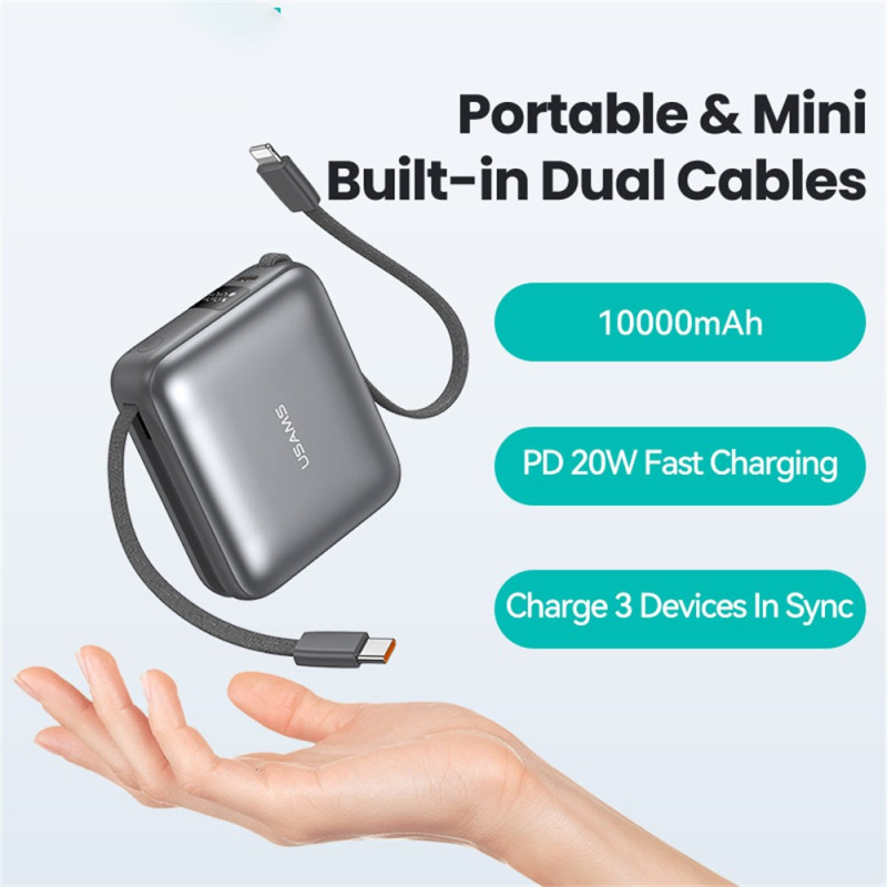Tässä ulkoisessa USAMS-akussa yhdistyvät teho ja käytännöllisyys kompaktissa muodossa, joka on suunniteltu kulkemaan mukanasi kaikkialle. Sen 10000 mAh:n kapasiteetti tarkoittaa, että se voidaan ladata useita kertoja, ja 20 W:n tekniikka takaa nopean ja turvallisen virran yhteensopiville laitteille. Integroidut Type-C- ja Lightning-kaapelit tarkoittavat, ettei ylimääräisiä lisävarusteita tarvitse kantaa mukana, ja kolmen käytettävissä olevan portin ansiosta voit ladata useita laitteita samanaikaisesti. LED-näytössä näkyy selvästi jäljellä oleva latausprosentti, joten sitä on helppo seurata heti.
