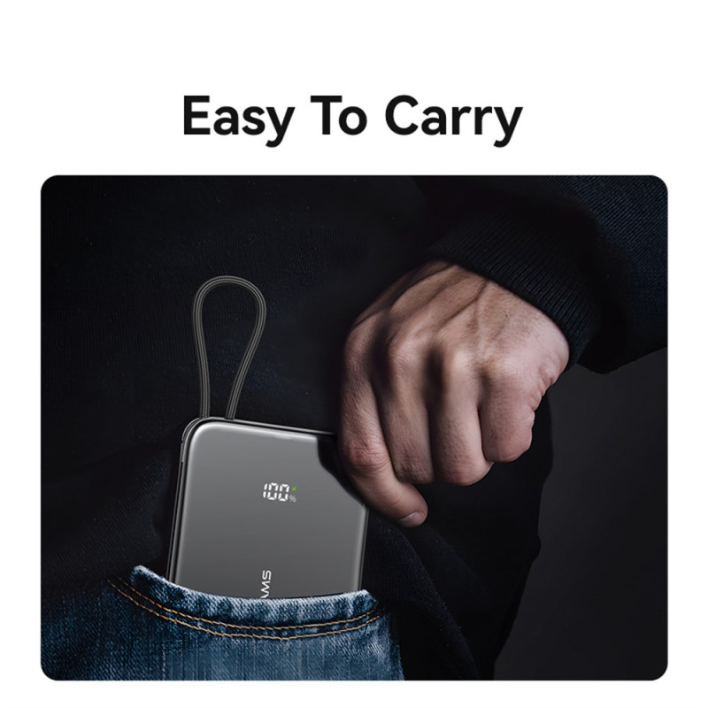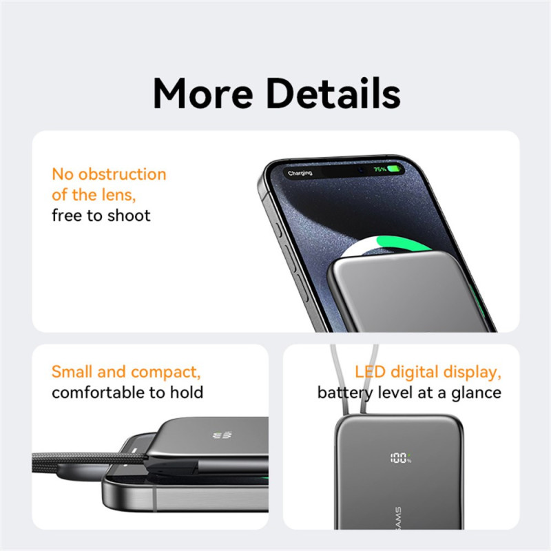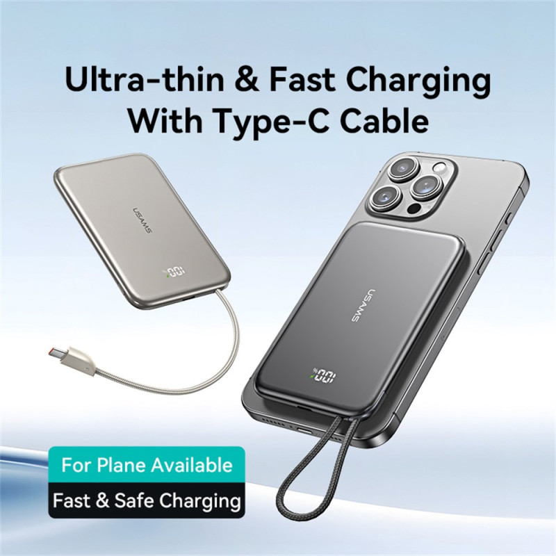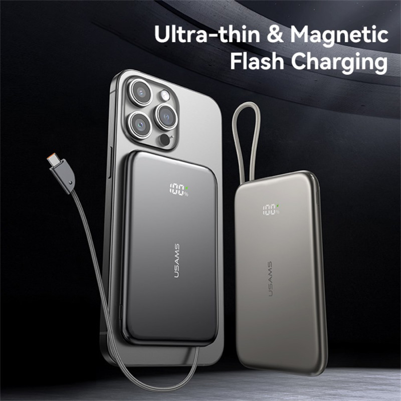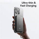 Tässä 5000 mAh:n magneettisessa ulkoisessa akussa yhdistyvät ohuus ja suorituskyky yksinkertaiseen ja mukavaan jokapäiväiseen käyttöön. Sen erittäin ohut muotoilu sujahtaa helposti taskuun, ja integroidun Type-C-kaapelin ansiosta sen voi ladata ilman lisävarusteita. 20 W:n pikalataus takaa tehokkaan virransyötön, ja LED-näyttö antaa tarkan lukeman energiatasosta. Magneettikiinnityksen ansiosta se istuu luonnollisesti yhteensopiviin laitteisiin. Sisäänrakennetut suojat takaavat turvallisen käytön myös pitkittyneen latauksen aikana.