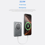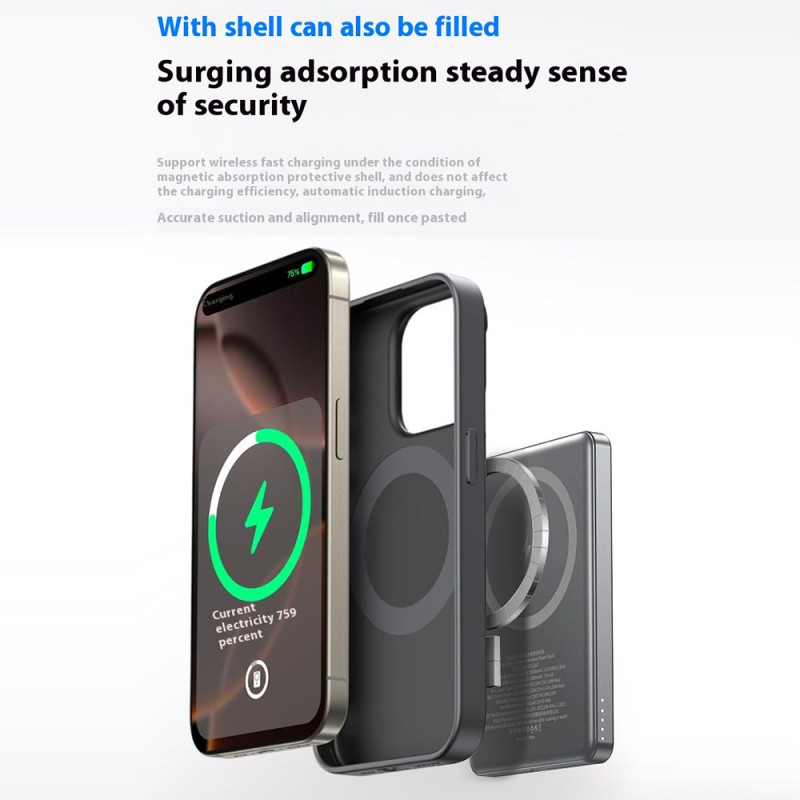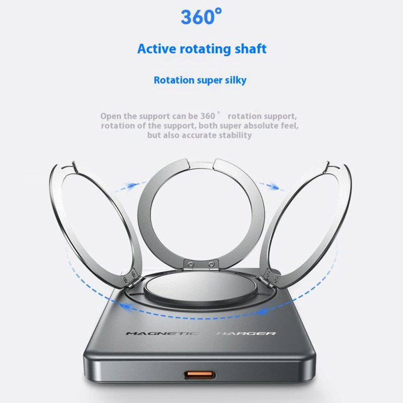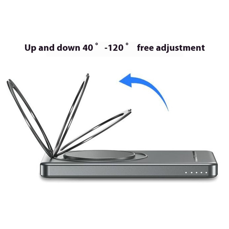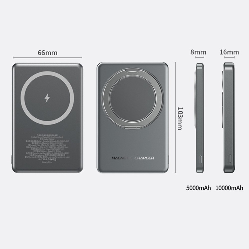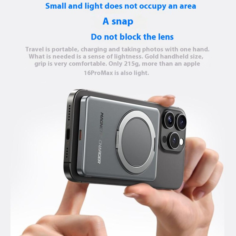 Tämä 10000 mAh:n magneettinen ulkoinen akku tarjoaa tehokkaan langattoman latauksen jopa 15 W:n teholla vahvistetun magneettikiinnityksen ansiosta. Se kiinnittyy suoraan MagSafe-yhteensopivien iPhonejen takaosaan yksinkertaista ja vakaata käyttöä varten. Kaksoislataustila, langaton tai langallinen jopa 22,5 W, tarkoittaa, että voit syöttää virtaa eri laitteisiin nopeasti. Sen LED-näyttö näyttää selvästi energiatason ja lataustilan. Integroitu metallirengas toimii sekä kokoontaitettavana jalustana että liukumattomana kahvana, joka on ihanteellinen sisällön katseluun tai otteen varmistamiseen. Sen kompakti alumiinimuoto tekee siitä käytännöllisen jokapäiväisen lisävarusteen.
