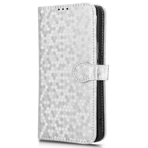 Tyylikäs lompakkokotelo PU-nahasta, jossa on kohokuvioitu polkka-aihe. Säädettävä jalusta-toiminto optimaalista handsfree-katselua varten. Integroidut taskut korteille ja muistiinpanoille. Mukana käytännöllinen käsihihna turvallista kantamista varten.