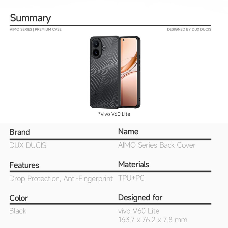 Suojaa Vivo V60 Lite 5G -puhelimesi tyylikkäästi DUX DUCIS Aimo -kotelolla. Sen kaksikerroksinen rakenne tarjoaa vankan suojan jopa 1,2 metrin korkeudesta putoamista vastaan, ja se on SGS-sertifioitu. Tyylikäs mattainen muotoilu sujuvilla linjoilla, mukava ote.
