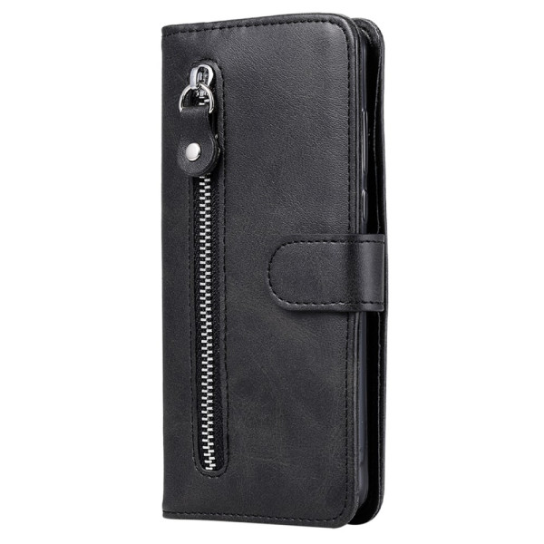 Tyylikäs lompakkokotelo kuvioidusta PU-nahasta, jossa on turvallinen vetoketjukiinnitys. Siinä on useita korttipaikkoja, vetoketjullinen lokero pienille tavaroille ja jalusta-toiminto. Täysi 360° suojaus vankalla TPU-kuorella.