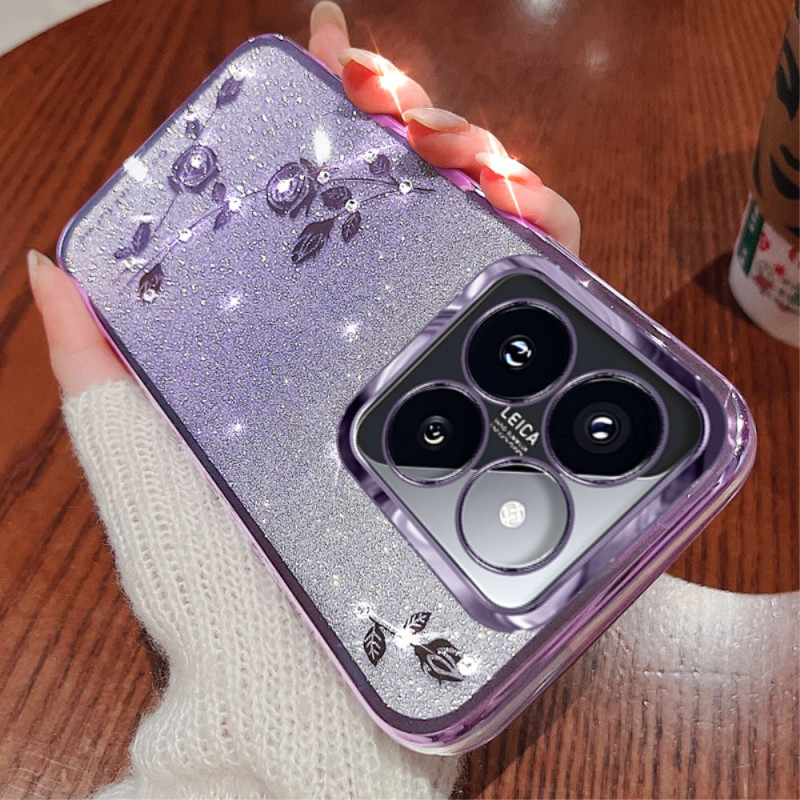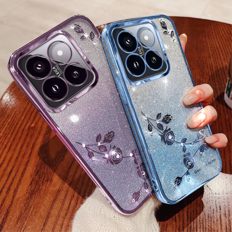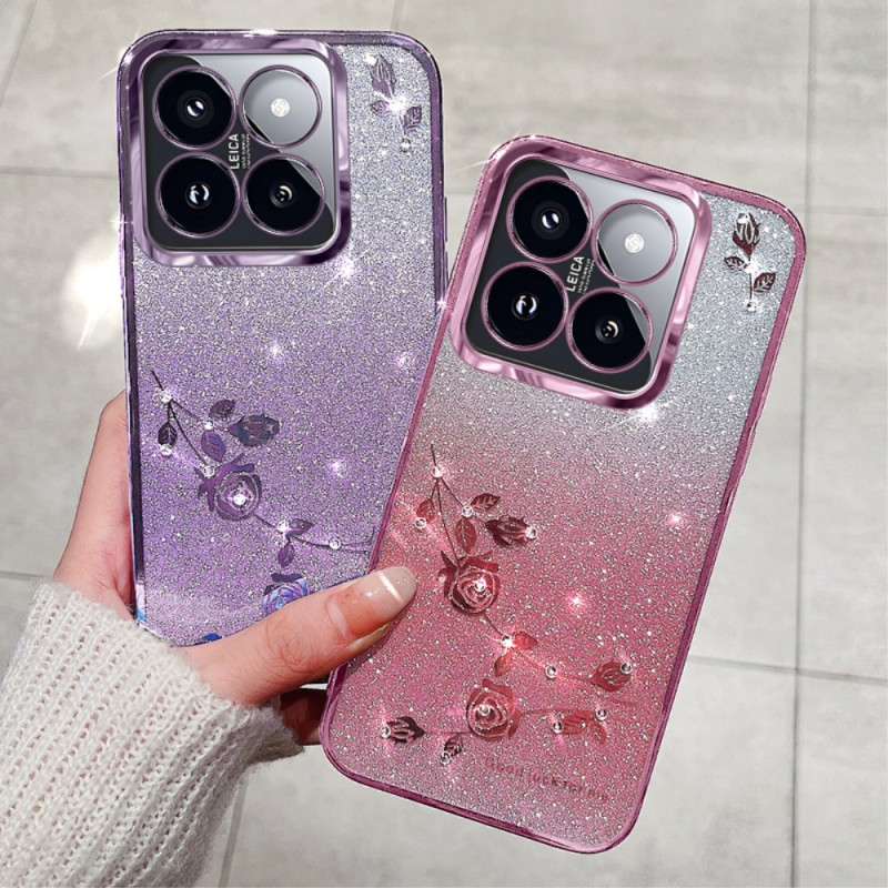 Sen kimalteleva muotoilu, jossa on kukka-aihe ja asteittainen glitter-viimeistely, tuo laitteeseesi ripauksen hienostuneisuutta.