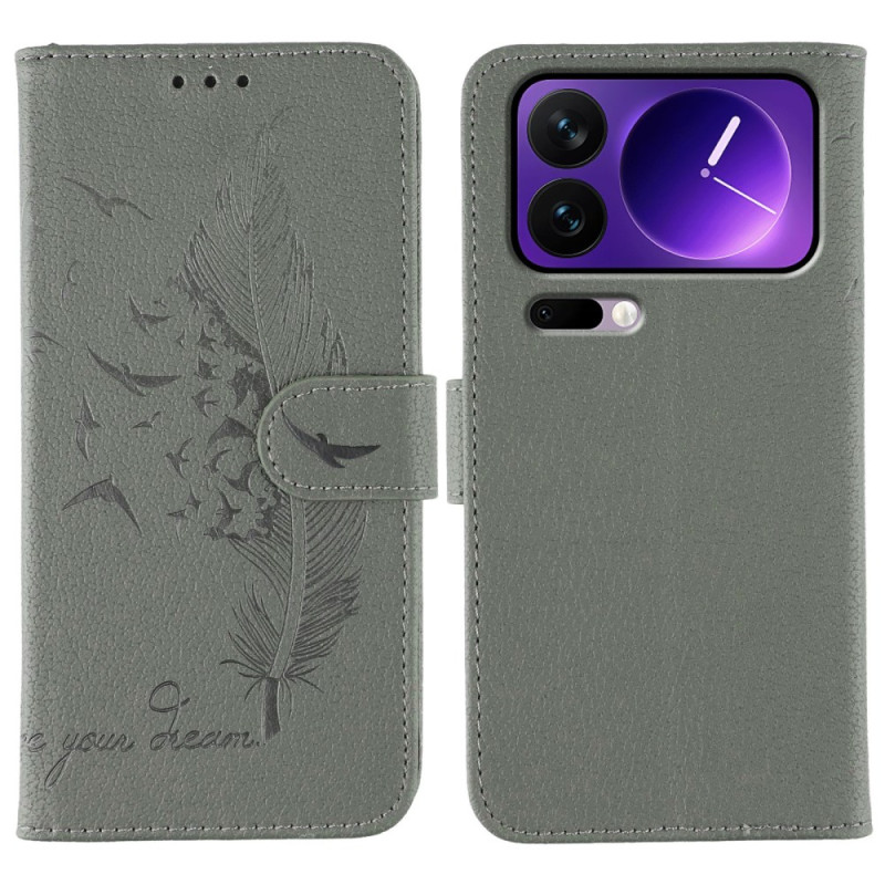 Étui portefeuille élégant en cuir PU avec motif plume gravé pour Xiaomi 17 Pro. Design raffiné avec support pliable, 3 emplacements pour cartes et compartiment latéral. Fermeture magnétique sécurisée pour une protection optimale et un accès facile.