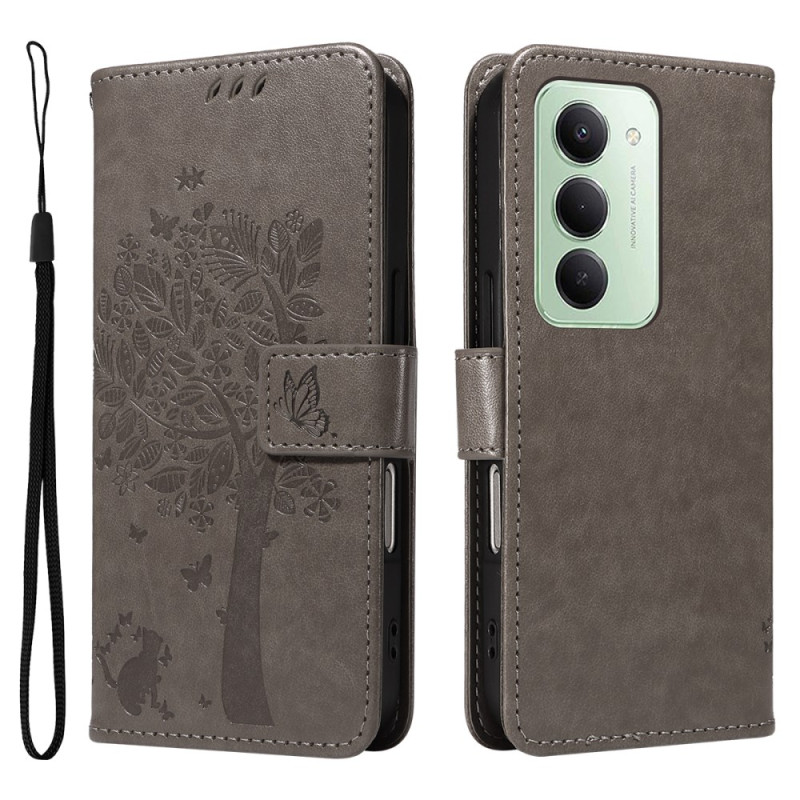 Premium nahkamainen lompakkokotelo, jossa on kissa ja puu design Xiaomi Redmi 15 4G (EU). Tarjoaa tyylikkään ja kestävän suojan sekä käytännöllisiä ominaisuuksia, kuten integroidun jalustan, korttipaikat ja käsihihnan.
