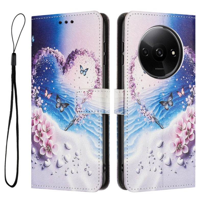 Suojaa Xiaomi Redmi A3, A3x tai Poco C61 -puhelimesi tyylikkäästi tällä tyylikkäällä lompakkokotelolla, jossa on sydämenmuotoinen perhoskuvio. Kotelossa on korttilokerot, taitettava jalusta ja käytännöllinen käsihihna, ja siinä yhdistyvät toiminnallisuus ja hyvä ulkonäkö.