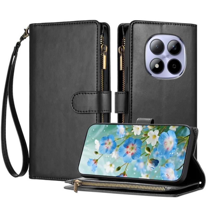 Étui multifonctionnel en cuir PU premium avec support intégré et fermeture éclair. Combine protection antichoc et praticité avec 8 emplacements cartes, poche zippée et dragonne amovible. Solution tout-en-un pour remplacer votre portefeuille.