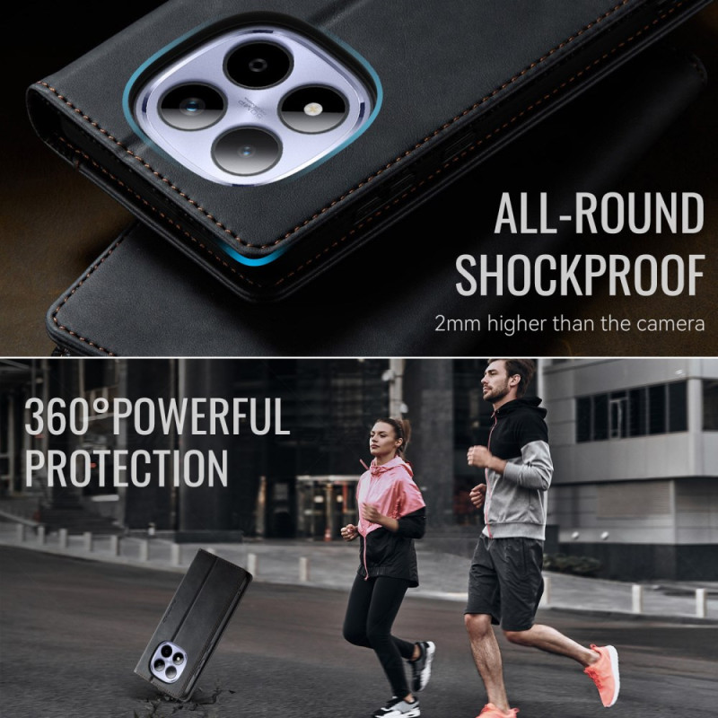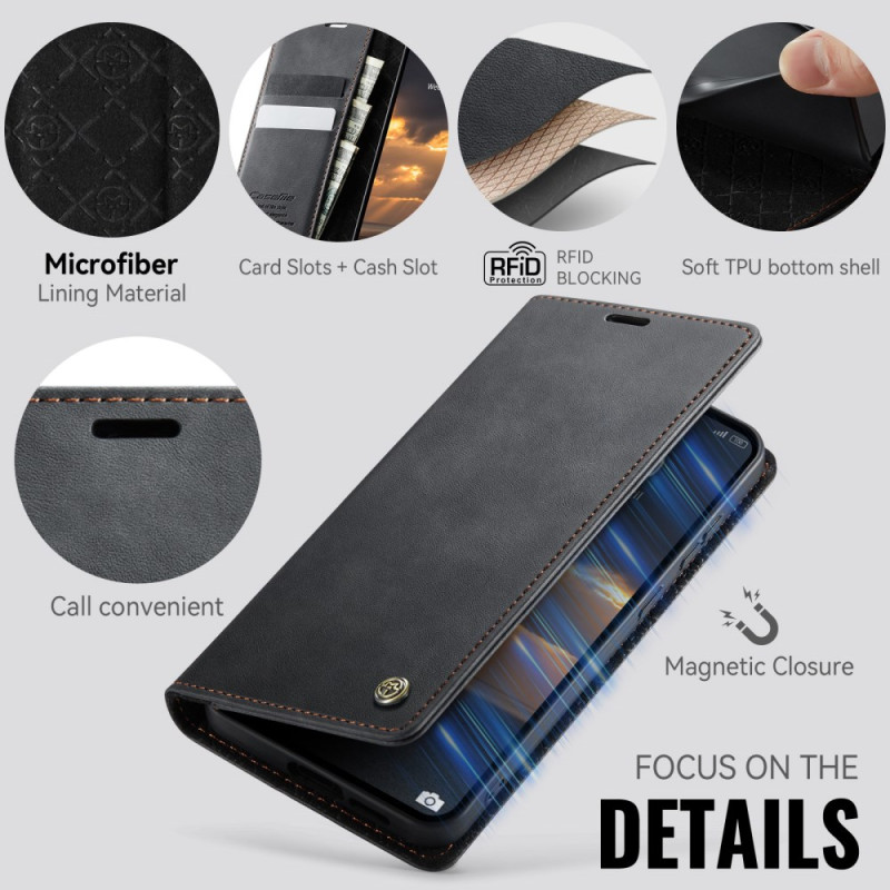 Tyylikäs lompakkokotelo, jossa on integroitu RFID-suojaus henkilötietojesi suojaamiseksi. Käytännöllinen muotoilu, jossa on 2 korttipaikkaa ja muistiinpanotasku. Säädettävä jalusta-toiminto handsfree-katseluun.