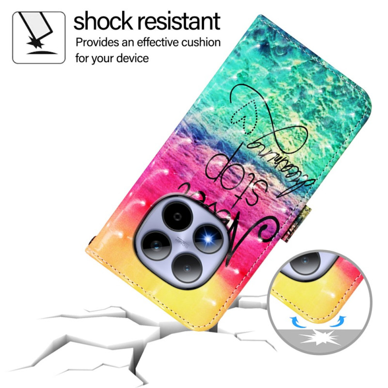 Suojaa Xiaomi Redmi Note 15 Pro 5G -puhelimesi tyylikkäästi tällä monikäyttöisellä lompakkokotelolla. Inspiroiva "Never Stop Dreaming" -muotoilu, 3 korttipaikkaa, käteistasku ja säädettävä pidike handsfree-käyttöön.