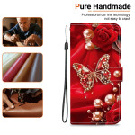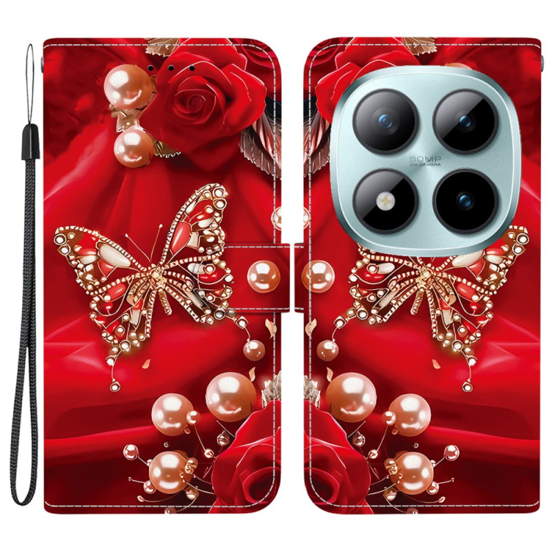 Tyylikäs lompakkokotelo, jossa taitettava jalusta ja irrotettava käsihihna Xiaomi Redmi Note 15 Pro Plus 5G:lle. Hienostunut vaaleanpunainen helmiäismainen perhosmalli. Turvallinen magneettisuljenta, 2 korttipaikkaa ja integroitu käteislokero.